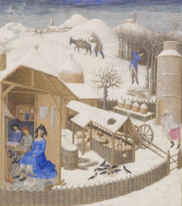 - Gebroeders Van Lymborch, Les Très Riches Heures de Duc de Berry, kalenderblad februari, ca. 1412-1416, tempera op perkament, 29,4 x 21 cm, Chantilly, Musée Condé, Ms. 65, fol. 2v